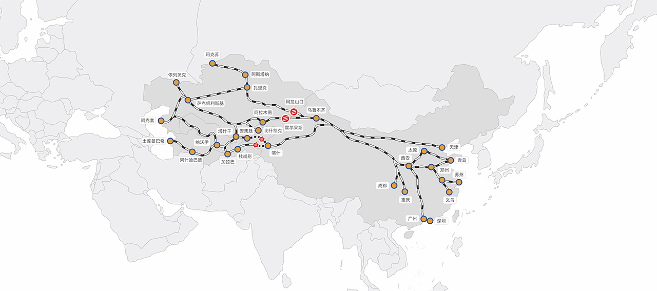 經(jīng)阿拉山口/多斯特克和霍爾果斯/阿騰科里轉(zhuǎn)關(guān)換裝,到達(dá)中亞五國(guó)(哈薩克斯坦、烏茲別克斯坦、吉爾吉斯斯坦、塔吉克斯坦、土庫(kù)曼斯坦)等各主要站點(diǎn)。