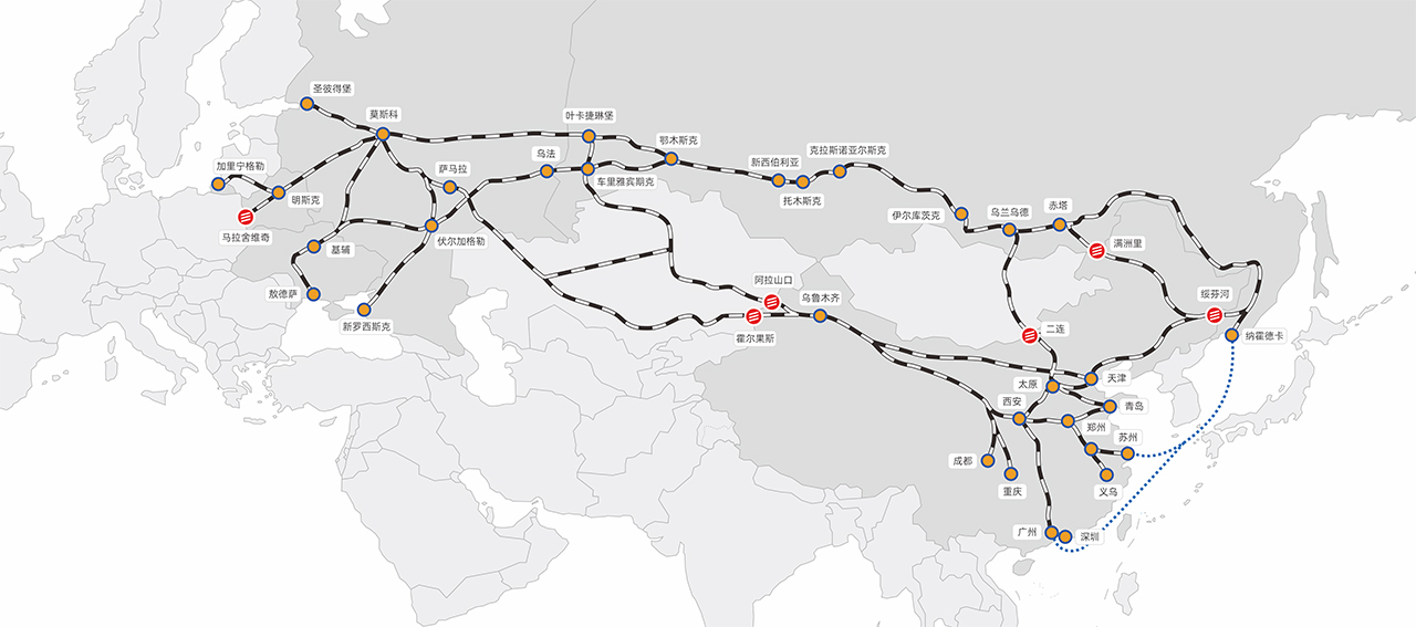 經(jīng)滿洲里/后貝加爾轉(zhuǎn)關(guān)換裝,直接到達(dá)俄羅斯境內(nèi)各主要站點(diǎn),可以到達(dá)俄羅斯的各大火車站,時(shí)間快,安全。