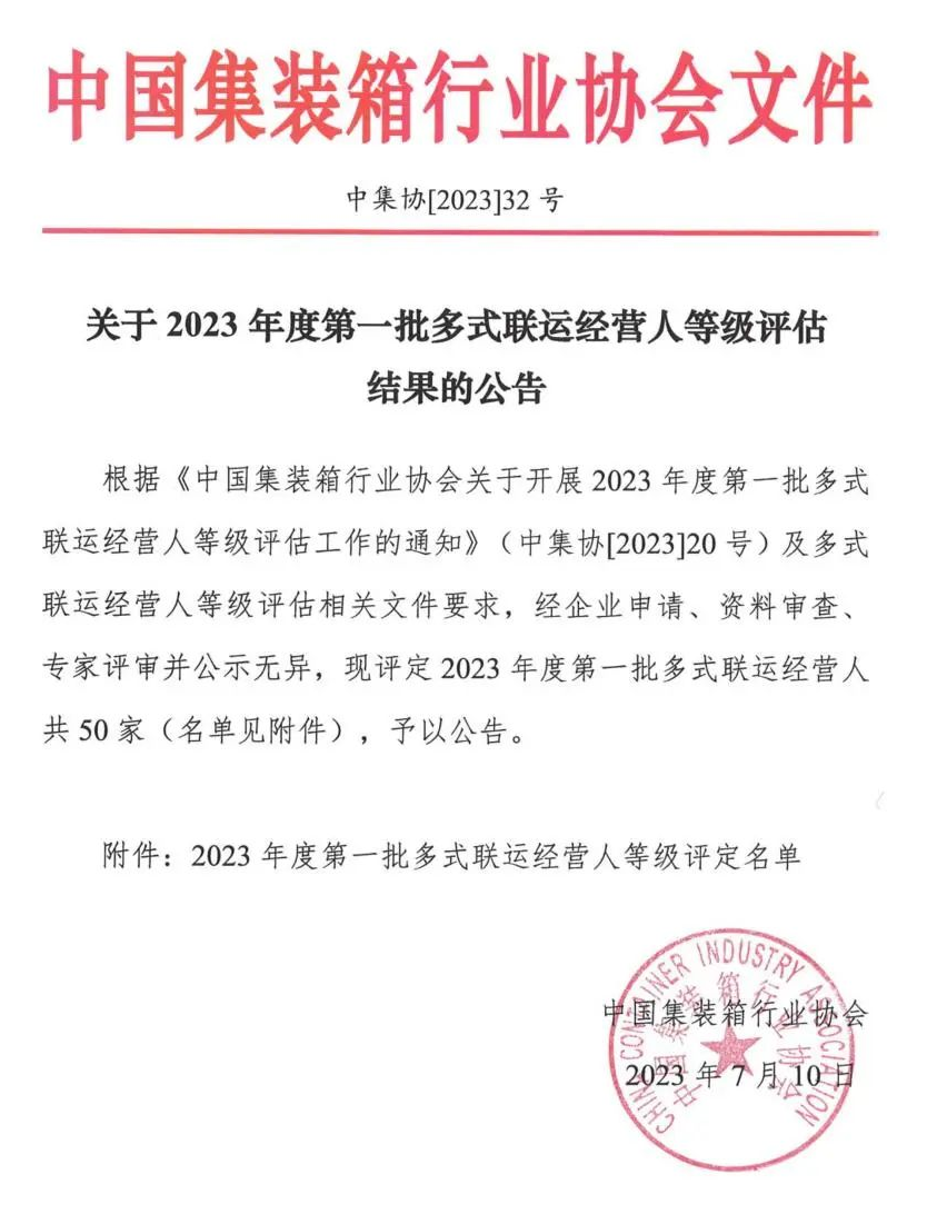 According to the Notice of China Container Industry Association on Carrying Out the First Batch of Multimodal Transportation Operator Grade Evaluation Work in 2023 (CCCIA [2023] No. 20) and related documents on multimodal transportation operator grade evaluation, after reviewing the information by the evaluation office of the association and organizing experts to conduct evaluation and collegiality, the results of the first batch of multimodal transportation operator grade evaluation for the year of 2023 were freshly released on July 10th. A total of 50 enterprises were selected.