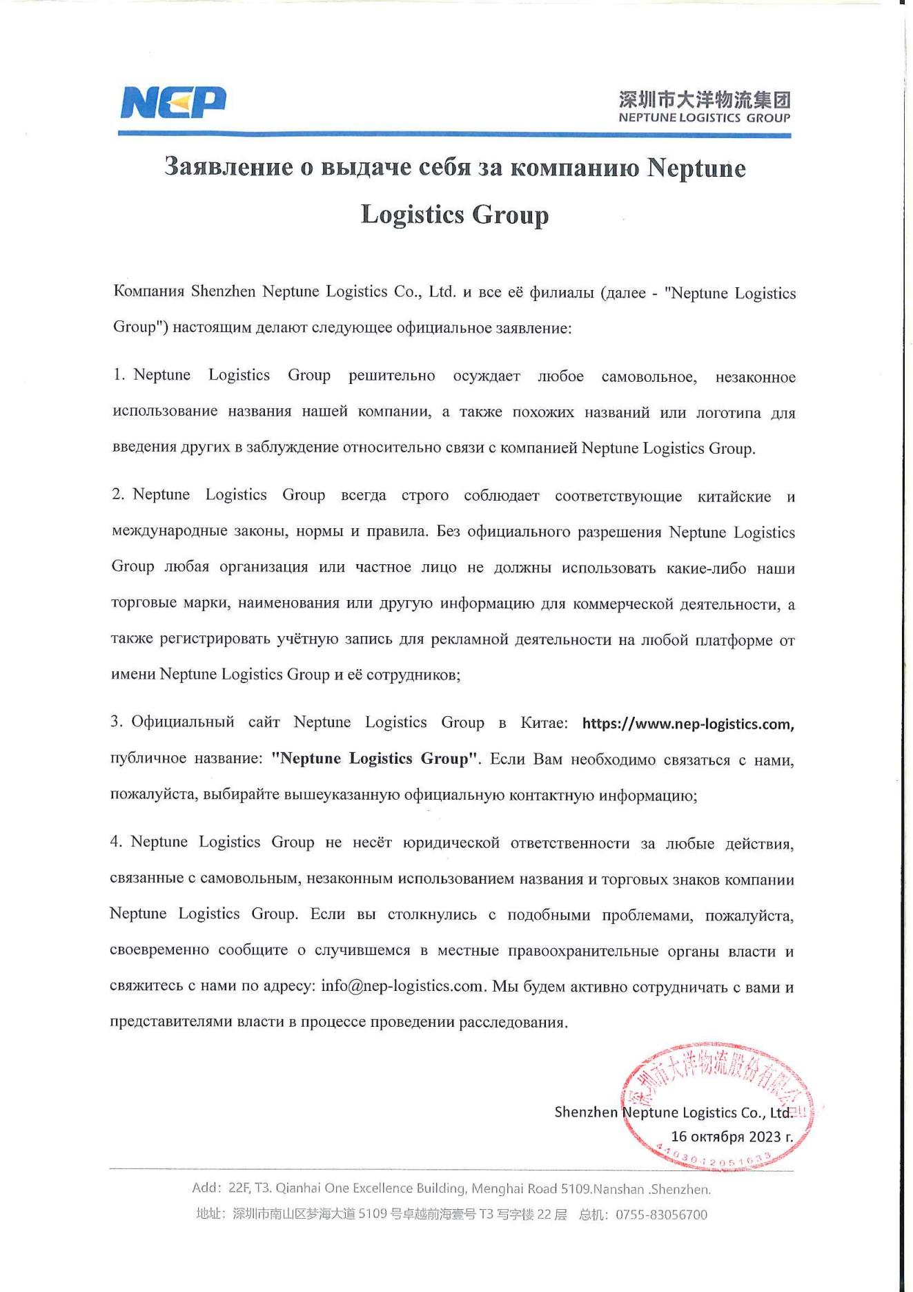 Компания Shenzhen Neptune Logistics Co., Ltd. и все её филиалы (далее - "Neptune Logistics Group") настоящим делают следующее официальное заявление: