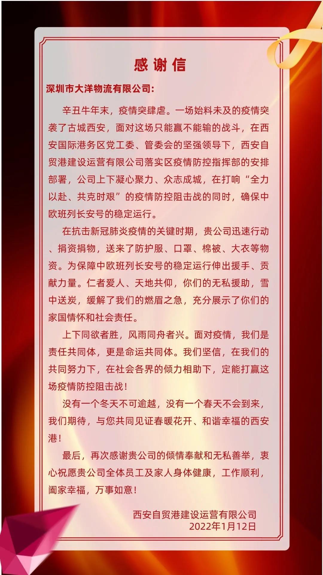 耗時五天,這批“一波三折”的抗疫物資已安全到達西安陸港并在抗疫過程中開始投入使用,我們也收到了來自西安自貿(mào)港建設運營有限公司的感謝信。