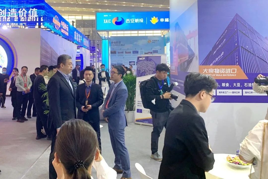 ▲西安市委常委、副市長黃強與大洋物流集團成都團隊負責人Edison Wang在展位上交談