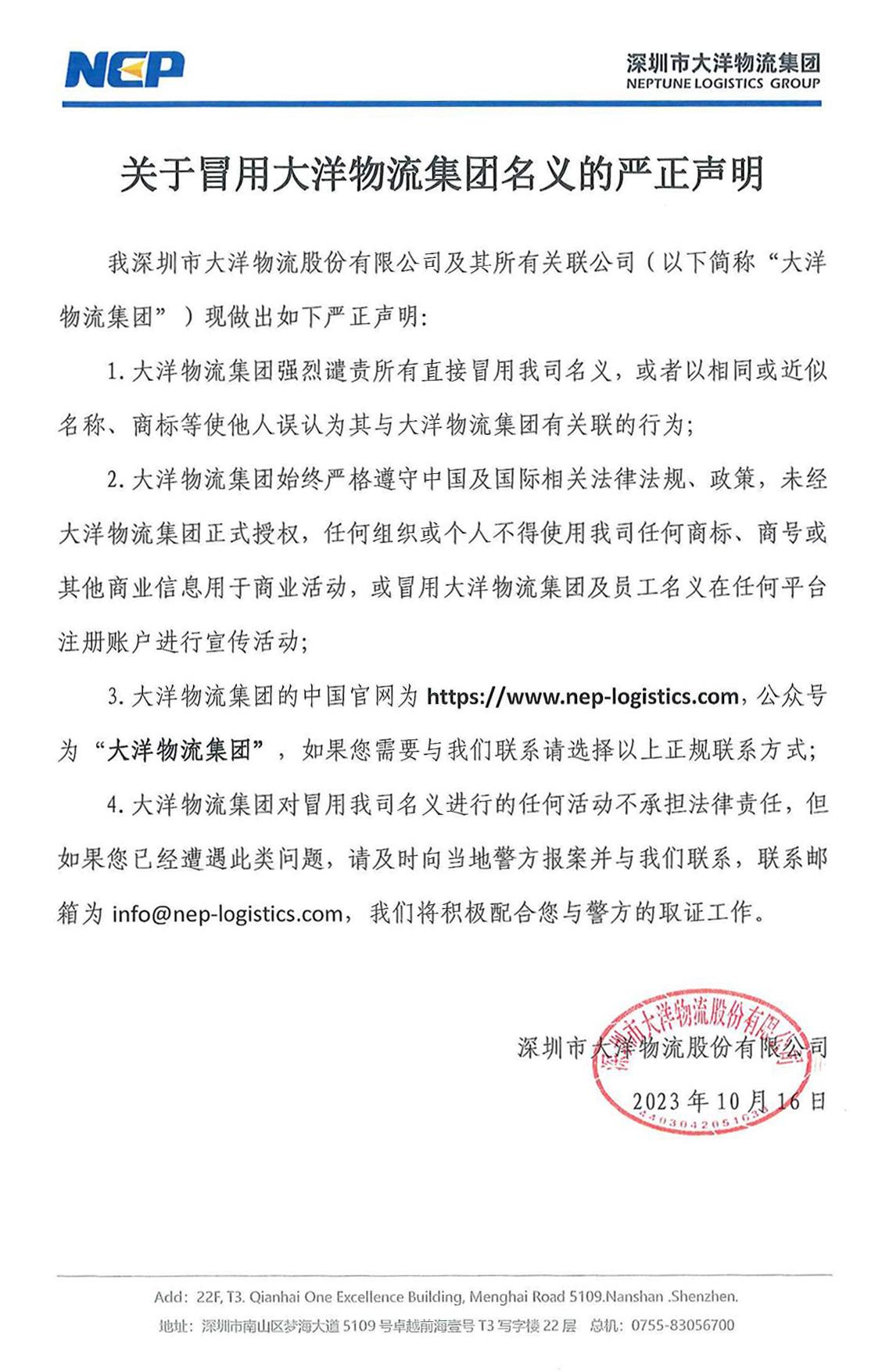 4.大洋物流集團(tuán)對(duì)冒用我司名義進(jìn)行的任何活動(dòng)不承擔(dān)法律責(zé)任,但如果您已經(jīng)遭遇此類問(wèn)題,請(qǐng)及時(shí)向當(dāng)?shù)鼐綀?bào)案并與我們聯(lián)系,聯(lián)系郵箱為info@nep-logistics.com,我們將積極配合您與警方的取證工作。