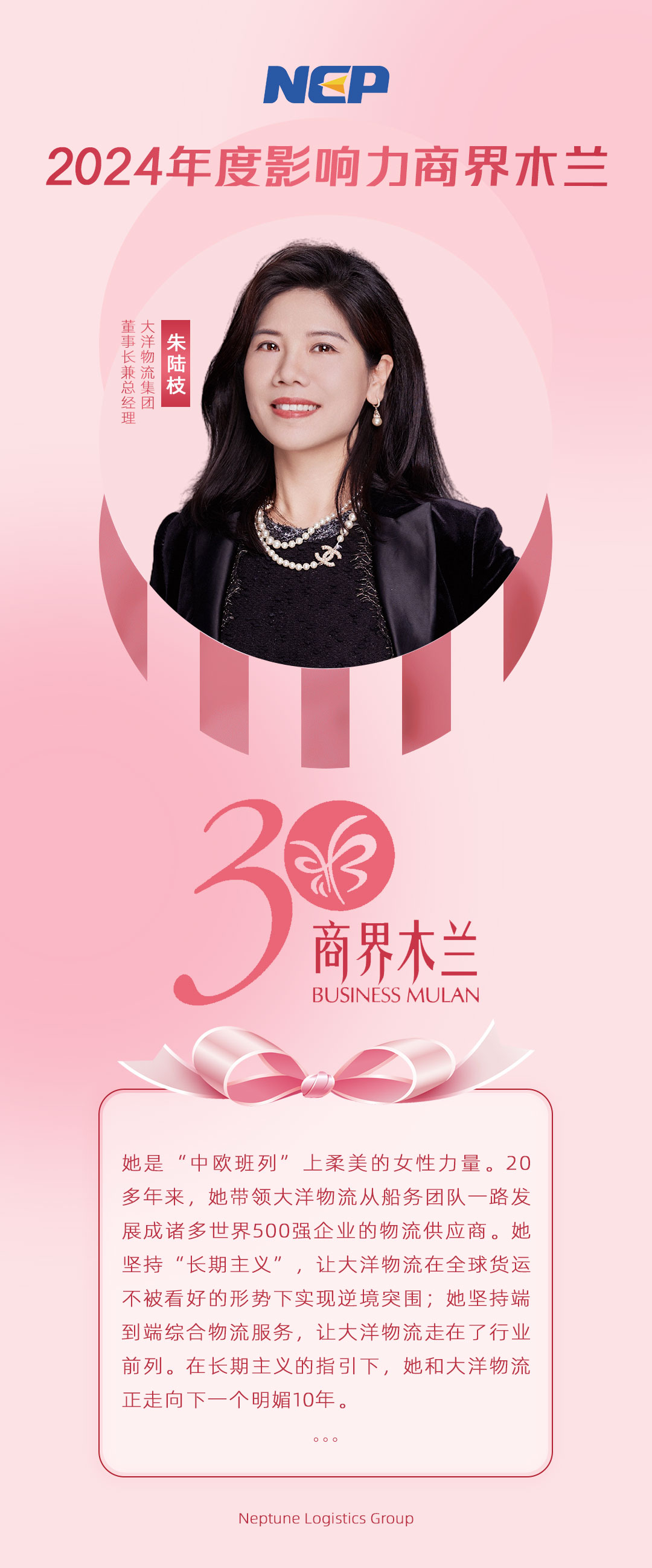 憑借著在“一帶一路”沿線國家和地區(qū)跨境物流所做出的突出成績,大洋物流集團(tuán)董事長兼總經(jīng)理朱陸枝入選“2024年度30位年度影響力商界木蘭”。