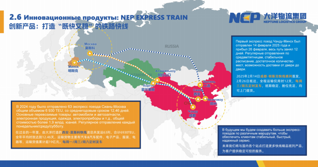 她分享了大洋物流運(yùn)營(yíng)的俄羅斯-中國(guó)及東南亞的進(jìn)出口班列,定制化物流解決方案案例,以及在數(shù)字物流方面的成效。其中,重點(diǎn)介紹了大洋物流的創(chuàng)新產(chǎn)品——大洋快線(xiàn)。該產(chǎn)品每周一/三/六開(kāi)行,在過(guò)去一年中,平均時(shí)效達(dá)到10-12天,未來(lái)將實(shí)現(xiàn)每天開(kāi)行一列。她表示:“大洋快線(xiàn)是我們精心打造的高效運(yùn)輸產(chǎn)品,通過(guò)優(yōu)化運(yùn)輸線(xiàn)路、提升裝卸效率等措施,有力提升了中俄物流運(yùn)輸效率,為客戶(hù)提供了更加穩(wěn)定高效的物流服務(wù)。”